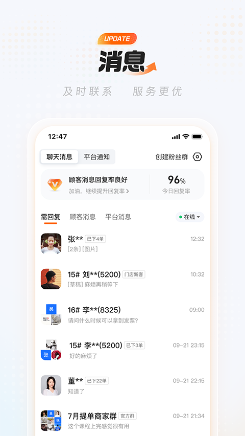 平台消息、顾客消息等重要通知一览无余,方便您查看平台各类通知,及时维护顾客消息。