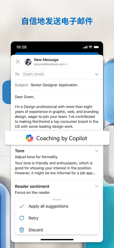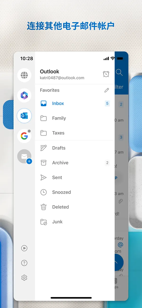 获得最佳的移动电子邮件体验。无需在不同的应用间进行切换,即可管理 Outlook.com、Gmail、Yahoo!邮件和其他电子邮件帐户。