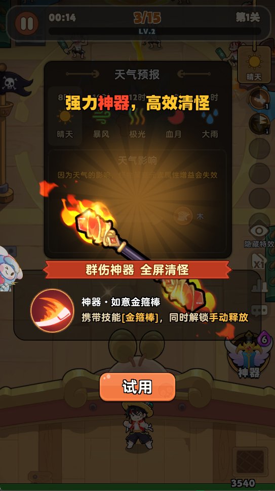 如意金箍棒作为强力神器,战斗中优先激活,利用其范围清怪能力,快速清理海量海盗,缓解战场压力。
