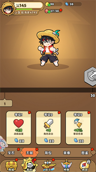 船长界面优先点满血量(提升生存)和角色攻击(提升输出),前期宝石稀缺,优先投入核心天赋,避免分散资源。