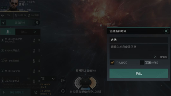 而每一个指令都可以通过长按来控制离目标的终点距离,老玩家们在00地区常说的“跳星门100”,就是向某个星门跃迁时拉100km的距离,以查看周围情况。