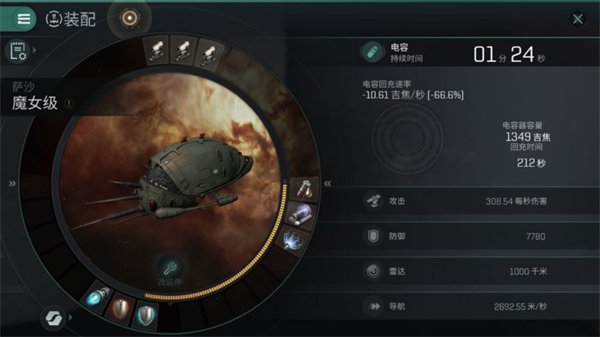右边的黄条代表舰船的电量,大部分装备的启用都需要消耗电量,同样是在“装配”界面,我们能够看到所有装备同时开启的话可以持续多长时间。