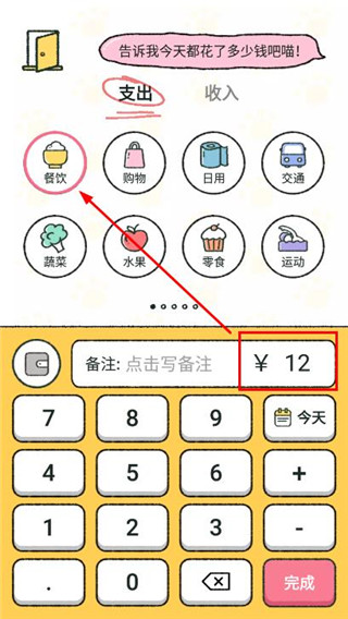 1、进入软件首页,点击记账,可以看到支出和收入两种选择,填写金额,选择不同的标签,点击完成即可
