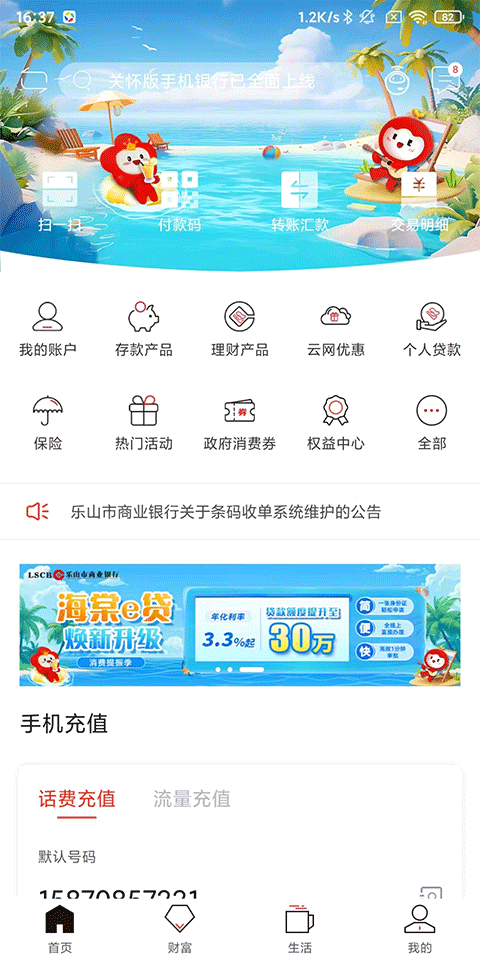 1、打开乐山商业银行APP,在首页可以体验扫一扫、付款码、转账汇款及交易明细等服务;