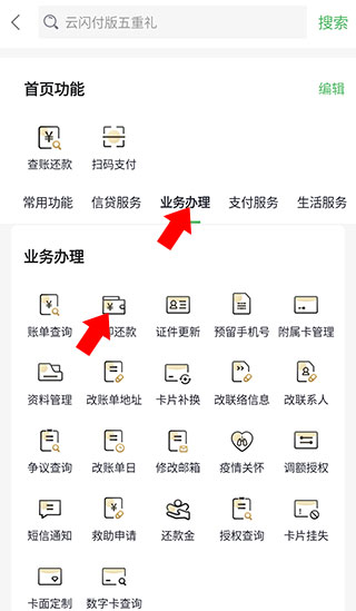 3、如果常用功能栏下没有找到“立即还款”,可以点击“业务办理”标签,即可找到“立即还款”选项
