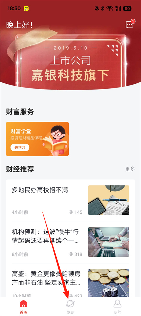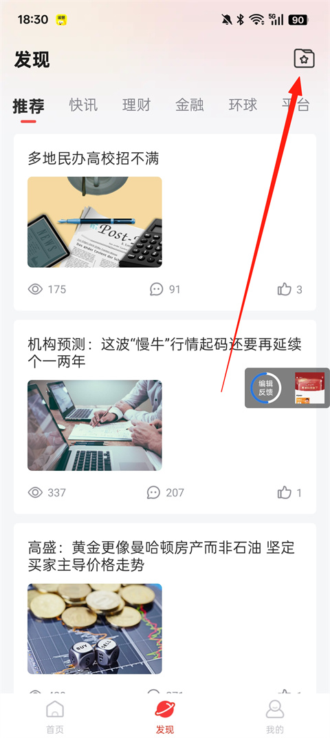 2、收藏好之后,想要再次阅读时,点击【发现】