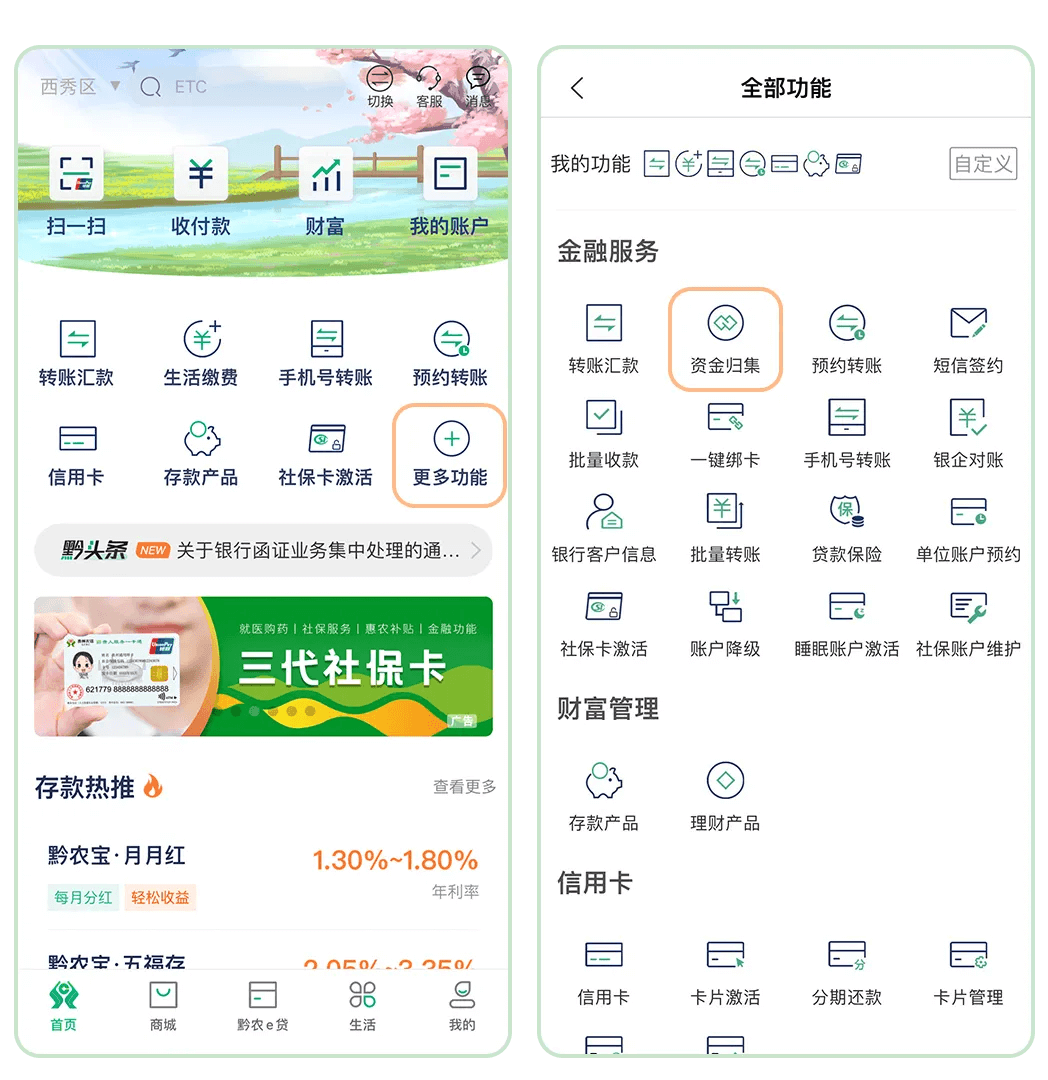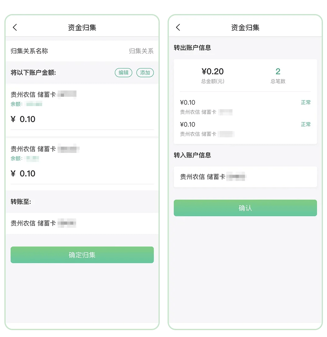 温馨提示:资金归集功能目前仅支持本人名下在贵州农信开户的储蓄卡使用哦!