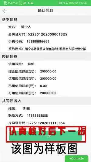 进入签约:客户信息(基本信息、授信信息、共同债务人等)展示,核对无误后点击“下一步”进入服务告知书。