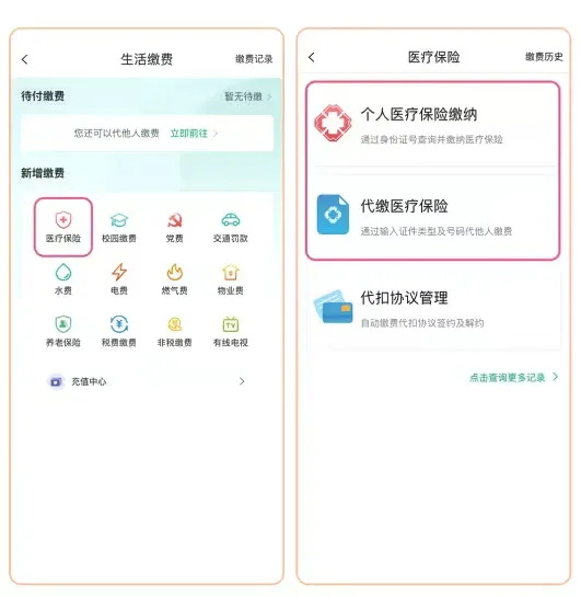 步骤二:点击“医疗保险”,个人缴费选择“个人医疗保险缴纳”,他人代缴选择“代缴医疗保险”。