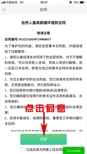 确认《自然人最高额循环借款合同》合同信息,可查看借款相关信息:借款人姓名、身份证号码、签约日期、合同履行地等,核对无误后点击“同意”。