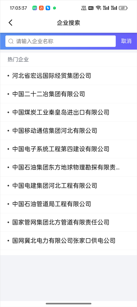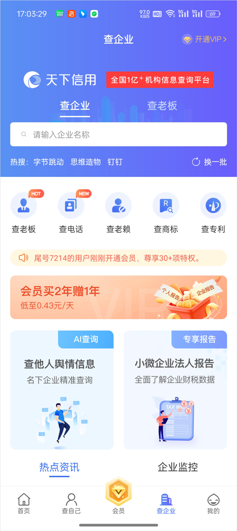 1、打开天下信用App之后点击查企业页面,点击上方的搜索框。