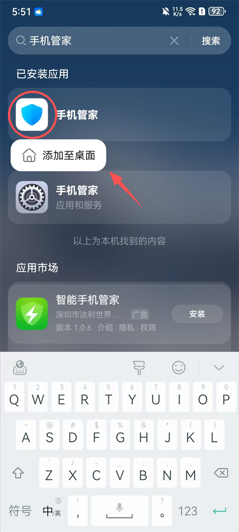 2、长按搜索的手机管家,点击【添加至桌面】;