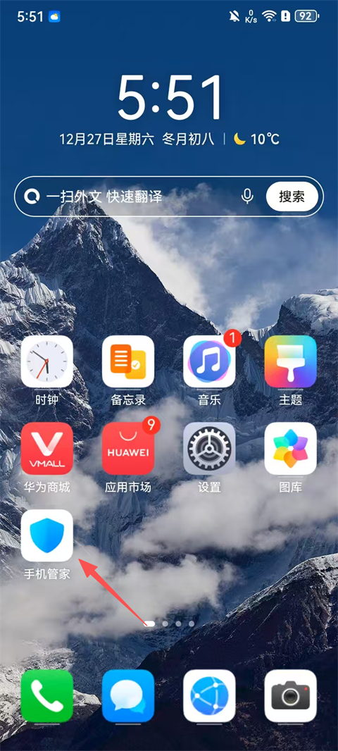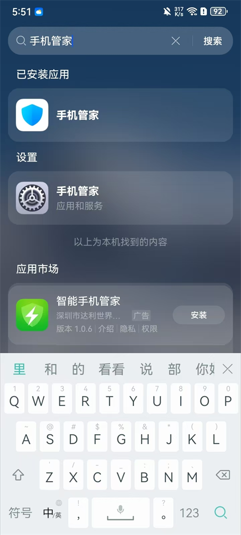 1、在手机桌面往下滑动调出快捷应用搜索列表,输入【手机管家】;