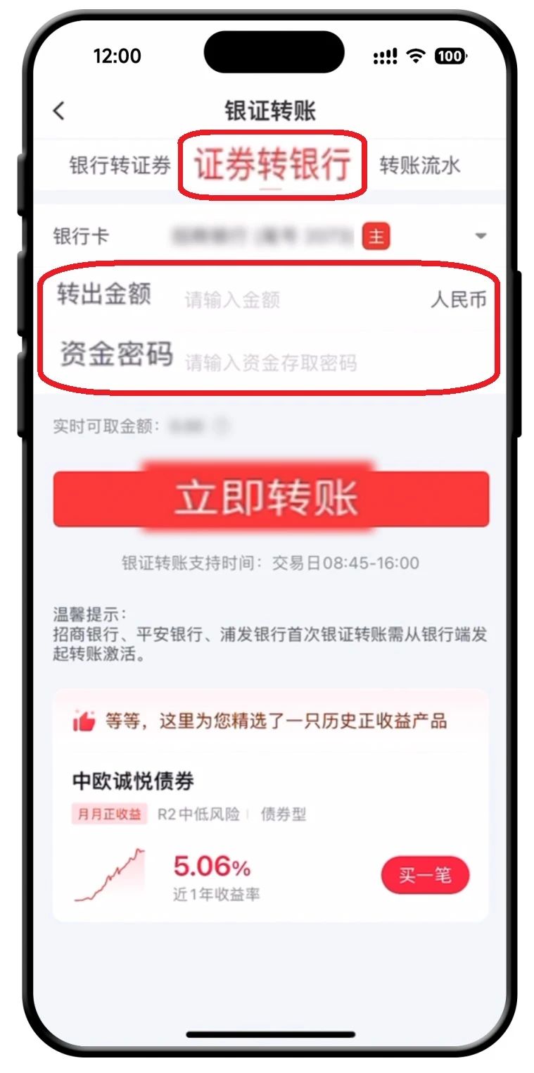 如果您选择的是银行里的钱转入证券账户,那么选【银行转证券】,选择银行卡,输入转入的金额,点击【立即转账】即可。
