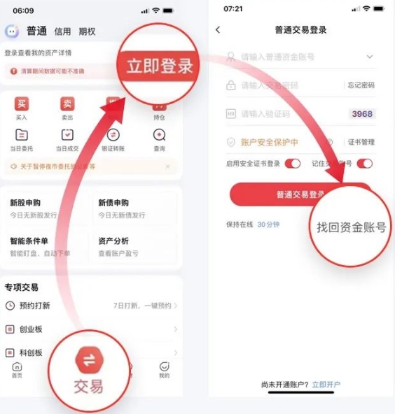 2.点击【交易】—【银证转账】—输入交易密码、验证码—【普通交易登录】