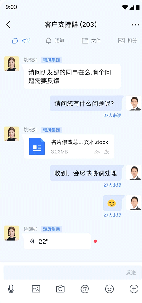 - 私聊、群聊、广播号、订阅号、智能机器人,各种对话类型满足你工作所需。