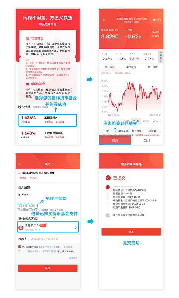 即日起,投资者通过工银瑞信基金APP买入指定货币基金后,无需再等待t+1日货币基金确认,即可赎回转购为非货币基金,享受指定货币基金转购其他基金手续费0折优惠,【灵活投资】【免手续费】两大期待,一次满足!