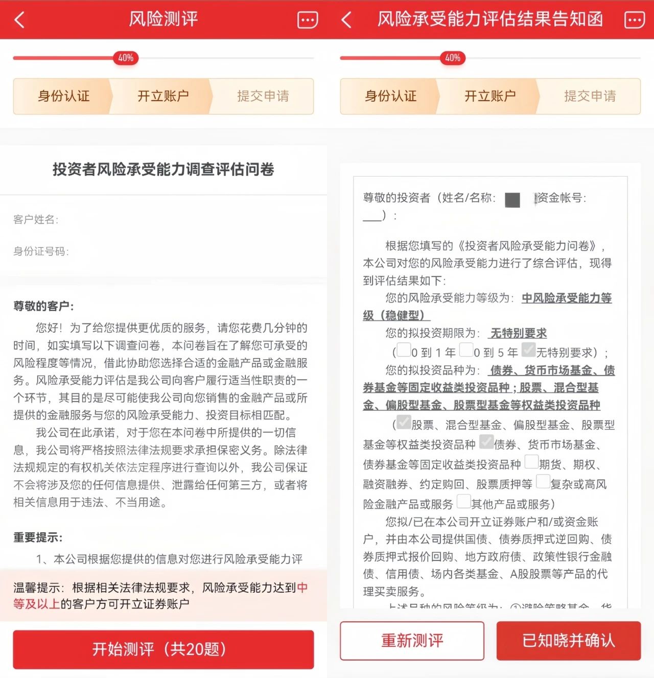 5.进入风险测评页面,完成【投资者风险承受能力调查评估问卷】并提交,页面弹出【风险承受能力评估结果告知函】,请阅读并确认