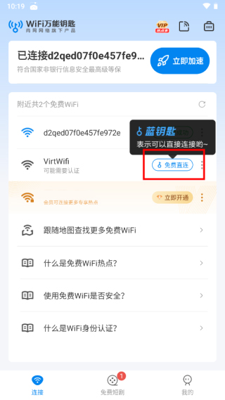 1、在本站下载安装WiFi万能钥匙进入,打开手机WiFi功能,即可自动搜索附近WiFi,有蓝钥匙表示可以直接连接,点击蓝钥匙;