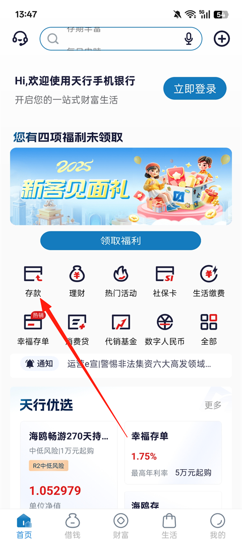 1、打开天津银行App,点击首页的【存款】
