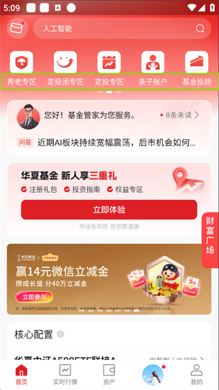 1、打开华夏基金管家App,首页设有养老专区、定投团专区、亲子账户、基金投顾等入口。