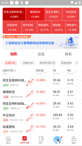 3、也可以点击行情板块,展示指数涨跌幅、PE、PB 百分位等数据,帮助投资者把握市场热点与指数估值情况。