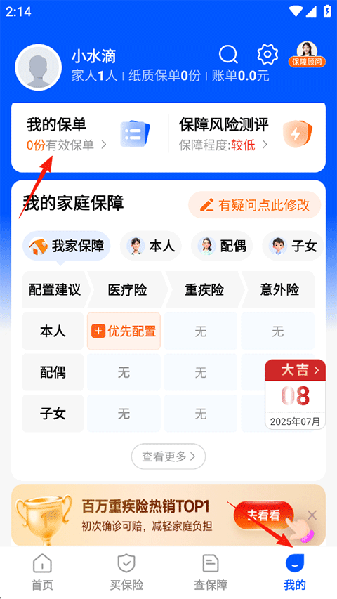 1、打开水滴保APP,点击我的-我的保单服务;