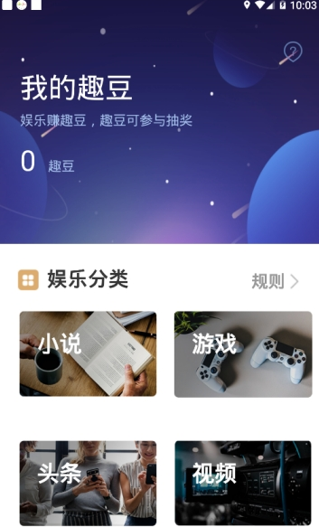 3、看小说和头条新闻:点击下方【娱乐】就能进入,有小说和头条新闻供大家阅读,但只能获得趣豆奖励。趣豆无法提现,只能抽奖看运气中实物。
