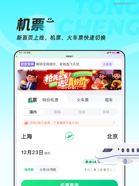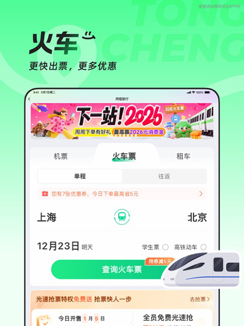 1、新客大礼:同程旅行APP新用户可在同程APP内参与领取新客大礼包,内含国内机票、火车票、国内酒店、景点门票、汽车票、用车打车等新客专享红包,先领券再下单更划算,详情以活动内规则为准。