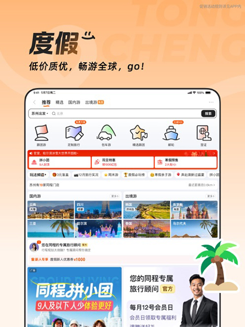 旅游,玩的就是开心,那些繁琐的出行相关问题就让同城旅游iPad版帮您轻松搞定吧。同城旅行由于强大的功能深受旅游爱好者的青睐,目前软件也是国内排名前三的旅游类软件,在信誉上绝对有保障,可以放心购买。更有超多全球热门景点,让你跟团、自由行都能随便玩。目前正值暑假,同程旅行iPad版推出了暑期大促,还能买一赠一哦,广大学生朋友们燥起来,点击指尖规划你的行程,尽情享受旅游的魅力吧。
