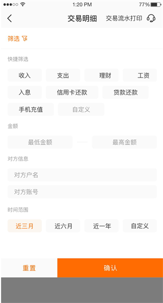 2.点击”筛选“,即可根据交易类型、金额、对方信息、时间范围等条件,查找想要查找的交易明细。