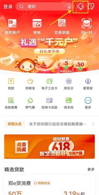 3.在郑州银行手机银行首页,点击右上角耳机图标,进入在线客服回复”交易明细“,点击即可查看。