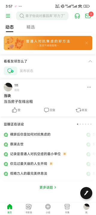 和生活在豆瓣的其他人一样,介绍自己时,你可以放大“关于我”的一切细枝末节,而不用担心陌生人没有耐心了解。暂时不谈相貌、年龄、职业,豆友们在豆瓣谈论的是自己喜欢的作家导演、坚持做的小事、最近的小发现、对社会事件的观点……你甚至可以通过成立一个小组或发起一个话题,将自己的独特放大到豆瓣的公共空间,影响和塑造彼此在豆瓣的生活。